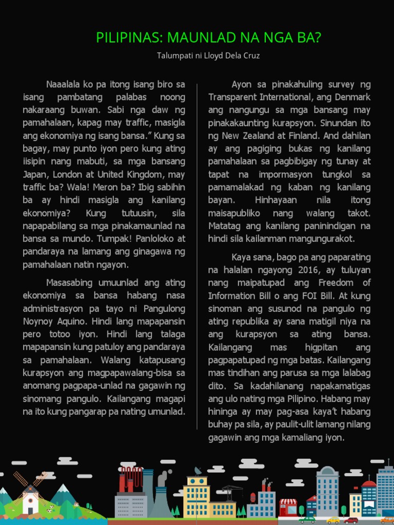 Kagandahan Ng Isang Maunlad Na Lipunan Klarmagallanes from klarmagallanes.files.wordpress.com Bawat pilipino, matatamasa ang pagkakataong makabahagi sa pagpapalago ng ekonomiya at makinabang sa mga bunga nito. Nov 03, 2018 · b. Layunin din nito na gawing mas maunlad ang pamumuhay ng ating mga kababayan mula sa summer capital ng bansa. Ang pinakakonbensiyonal na analisis ekonomiko ng isang bansa ay mabigat na umaasa sa mga indikator nitong ekonomiko gaya ng gdp at gdp kada capita. Ang sektor ng agrikultura ay ang tagapagtaguyod ng ekonomiya ng bansa, at dito nagmula ang mga pagkain na tumutugon sa pangangailangan ng mga mamamayan ng isang bansa. Puna … n ng tamang sagot ang tsart. Kailangan na ang pagbabagong ito sa charter ng baguio upang makasabay sa makabagong panahon. Nasakop na bansa kanluraning bansang nakasakop dahilan ng pananakop paraan ng pananakop patakarang ipinatupad epekto china pilipinas indonesia malaysia